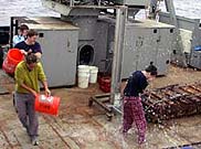 | On another note, the members of the Lost City Expedition would like to congratulate Betsy Williams on her first Alvin dive. As she stepped out of the sub, she received the traditional congratulatory gesture-- several buckets of cold ice water! |